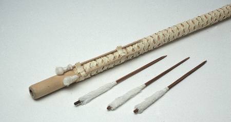 A blowgun (also called a blowpipe or blow tube) is a simple ranged weapon consisting of a long narrow tube for shooting light projectiles such as darts. It operates by having the projectile placed inside the pipe and using the force created by one's forced exhalation ("blow") to pneumatically propel the projectile.