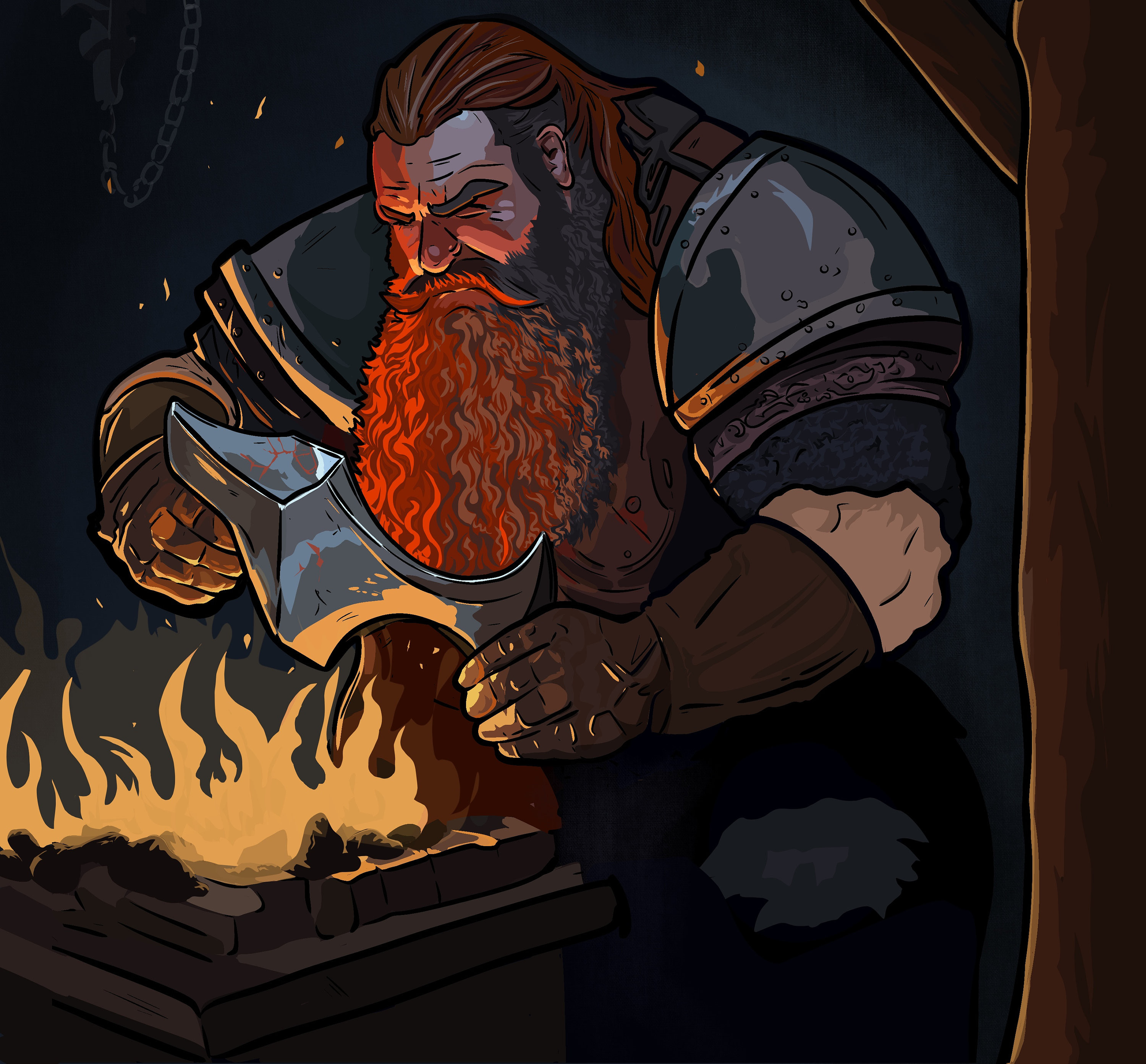Male dwarf, pale skin and curly red hair and beard. Wears a blacksmith's apron and worker's gloves and boots. Usually wields his smithing tools (large smithing hammer) and an amalgamation of self-made metal gadgets and armor. Irish accent