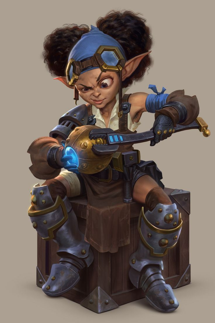 Male gnome, young kid. Coke bottle glasses and a nasally voice, wears goggles and an oversized leather apron