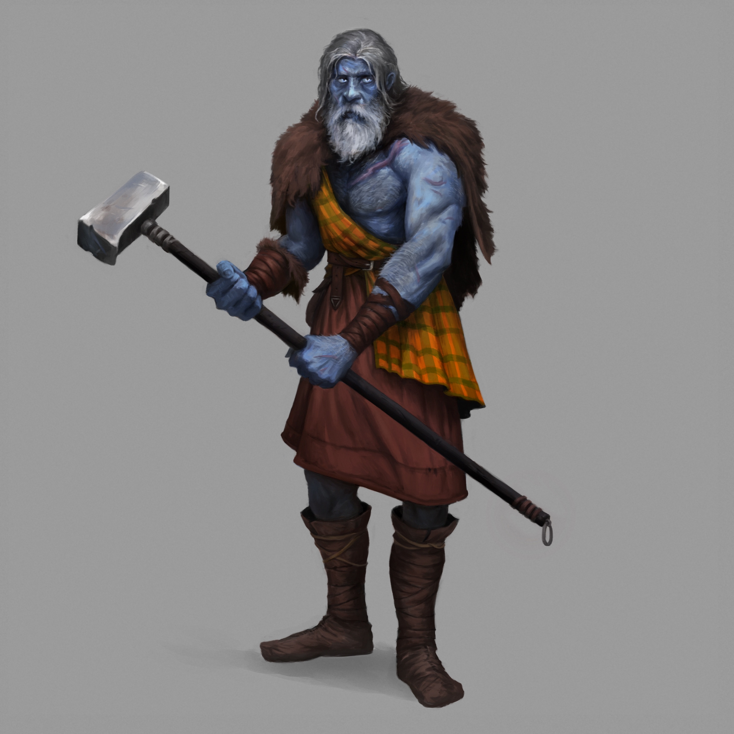 Skjor is an older goliath man, about 6'2" with dark blue and heavily tattooed skin. Skjor typically wears his hide armors or, when interfacing with the farmers, a set of overalls and a large straw hat. The overalls are significantly scratched up and worn, and the hat has a large slice missing from the brim. Skjor does not typically wear shoes or shirts, but he does always carry his two-handed greataxe. He speaks aggressively and swears often.