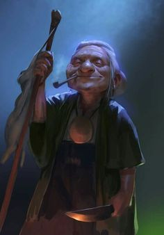 Elderly halfling woman, New York bayou accent. Always smoking a cigar, will bop crocodiles or others who threaten the boat with her oar.