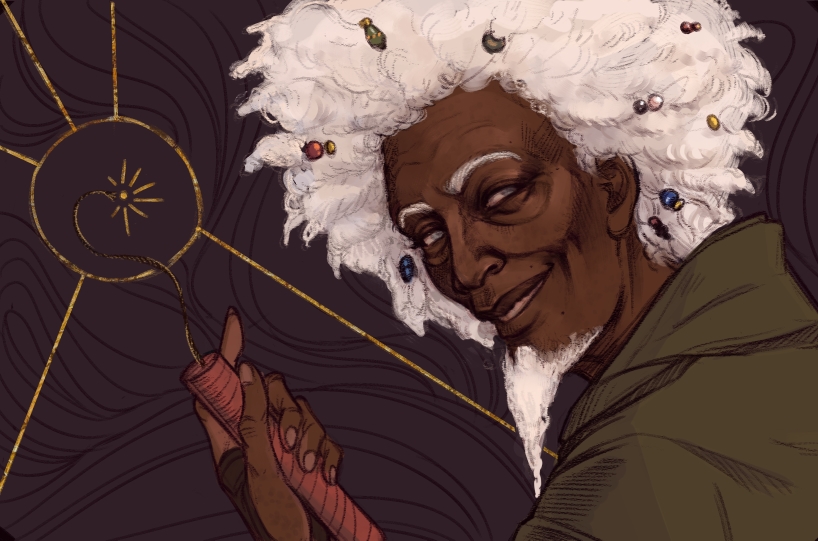 Alden Maelstrom was an elderly wizard with dark skin and a wild afro of white hair and a pointed white beard. He usually acted assertive yet disorganized, easily getting sidetracked or distracted.