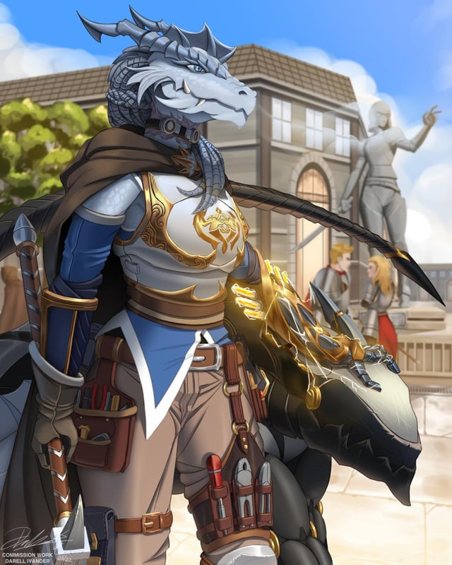 Silver dragonborn woman who serves as a Captain within the Goldguard. Captain Tibón often defends the northern gate of Sedesend for her ability to determine the true intentions of visitors, and intimidate the more pathetic criminal element to turning away before breaching the city.