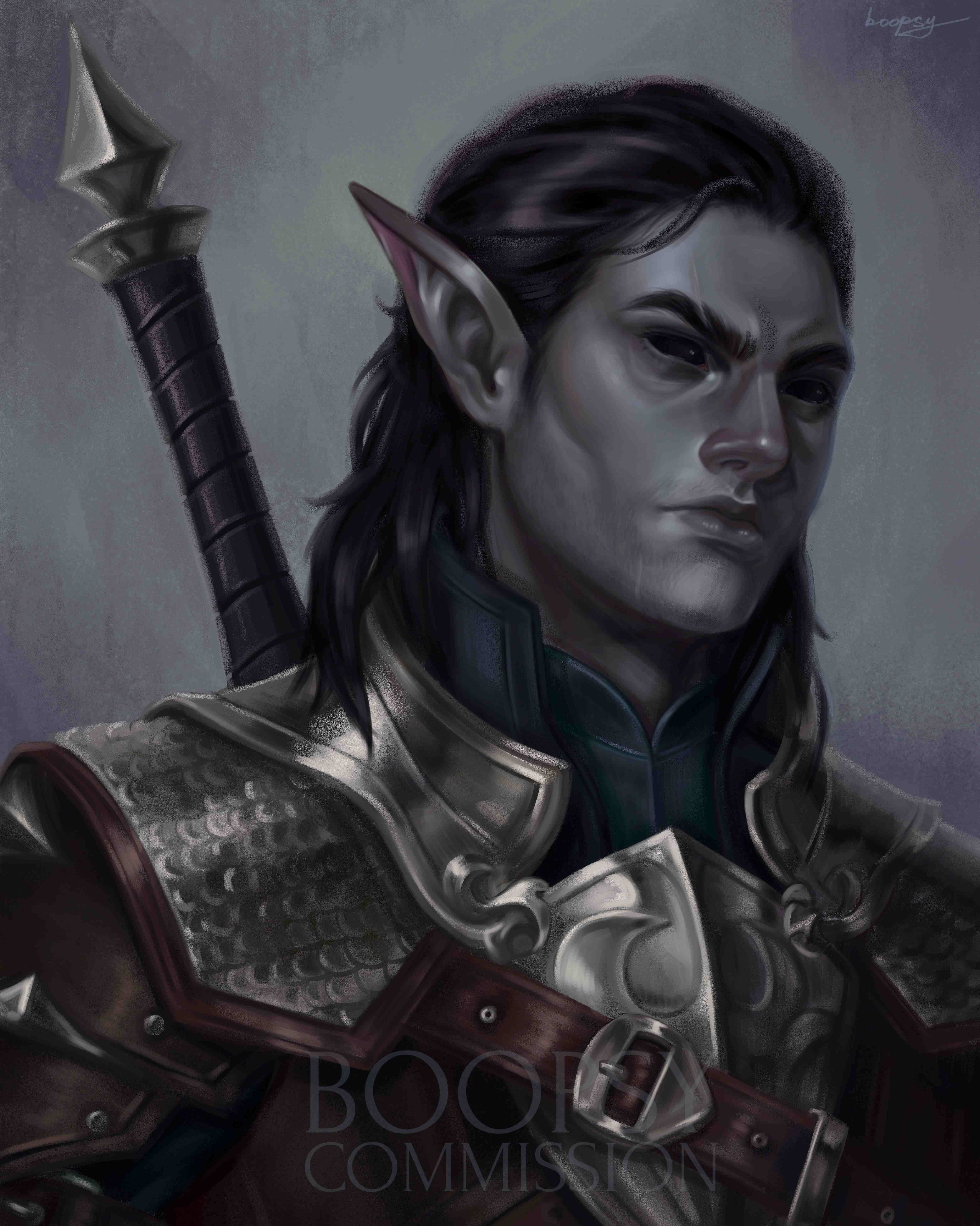 Warmaster Thorne Wolfsbane is a Shadar-kai Elf with grey skin, a closely-shaved head and a thick coarse of black hair for a beard. He wears dark grey steel armor and wields two shortswords.