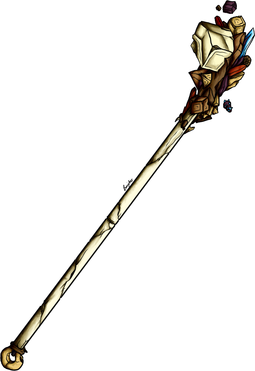 A thin, rough stone staff with a smooth orb of topaz at the top. The Stone Giants of the Topaz Bastion believe that the Staff of Peaks and Valleys ("Shovel") draws its power from the Primordial Shard of Earth which they formed their stronghold around.