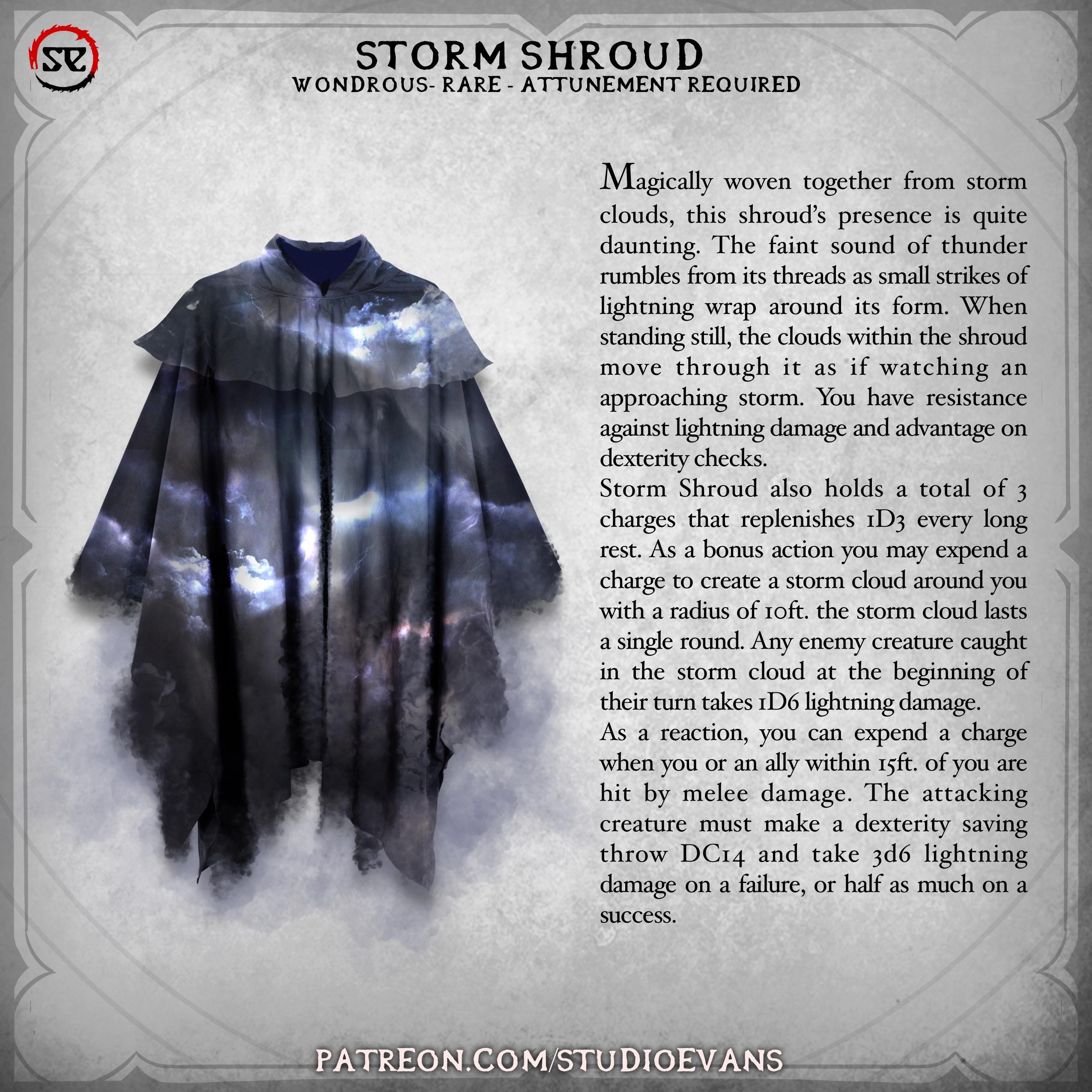 This grey cloak cracks with occasional illusory lightning, opaque and subtle through the clouded pattern when you walk or cast a spell. The cloak has 8 charges and regains 1d6 + 2