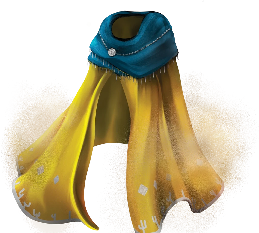 This golden cloak billows illusory sand around you when you walk or cast a spell. The cloak has 8 charges and regains 1d6 + 2 expended charges daily at dawn. While wearing the cloak, you can expend 1 or more of its charges to cast the following spells from it (save DC 15): blur (2 charges), call lightning (3 charges), create or destroy water (1 charge), or hallucinatory terrain (4 charges).