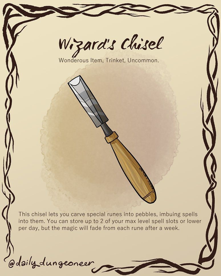 The chisel has 3 charges, recharging all each day. As an action, the chisel can be used to alter the form of a willing creature, chosen by percentile dice from the table from the Sibriex stat block (below). The change lasts for 1 hour. If the chisel is used on an individual who is already warped, the new effect and duration replace the old.