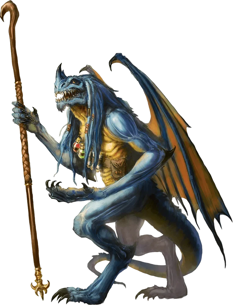 Vaerzel was an abishai who ran the Metal Whisperer, acting as an information broker within the Iron City of Dis. She was an older, blue-scaled reptilian Fiend with tiny spectacles and a golden staff topped with a sunrise motif. She spoke precisely and directly, not mincing words and easily denigrating most others.
