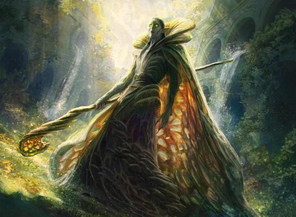 Mortain Donnaden was a Shadar-kai man with shoulder-length grey hair and bright green eyes. His skin was smoke grey and he often wore wizard robes of vibrant green. After his semi-transformation, His eyes grew large and more circular, glowing wholly green, and his skin grew sunken and further greyed. He wielded a long wooden staff of spongy black wood.