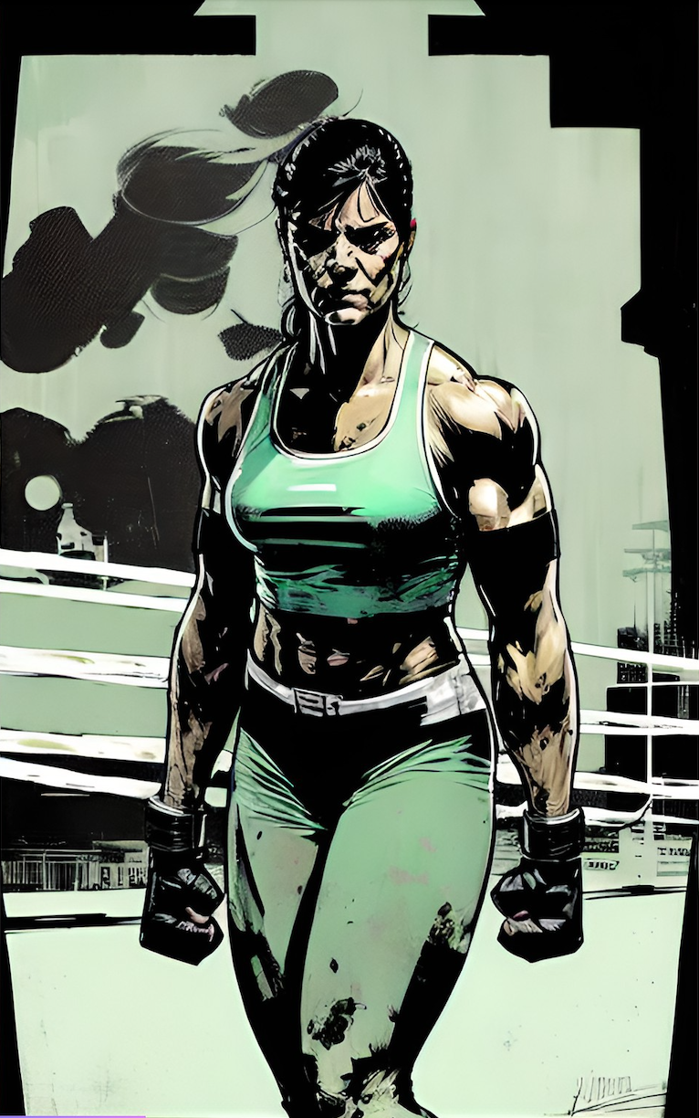 Description: Gina 'Gigantica' Dean is an imposing figure with almost superhuman strength and agility. She's a force to be reckoned with in the boxing world, and her opponents often find themselves overwhelmed by her power and skill. Standing at 6'2" and weighing 220 lbs, Gina is an intimidating presence both physically and mentally. She is a contender for the world championship title and has a reputation for being one of the toughest female boxers in Gotham City.
