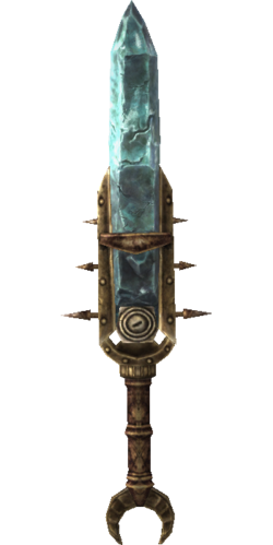 The blade of this dagger is made from a blend of Malachite and Moonstone, giving it a crystalline like appearance. Crafted with Dwemer metals, it is clear that care has been taken to make it look exactly like the Artifact known as Keening. This weapon has also been enchanted.