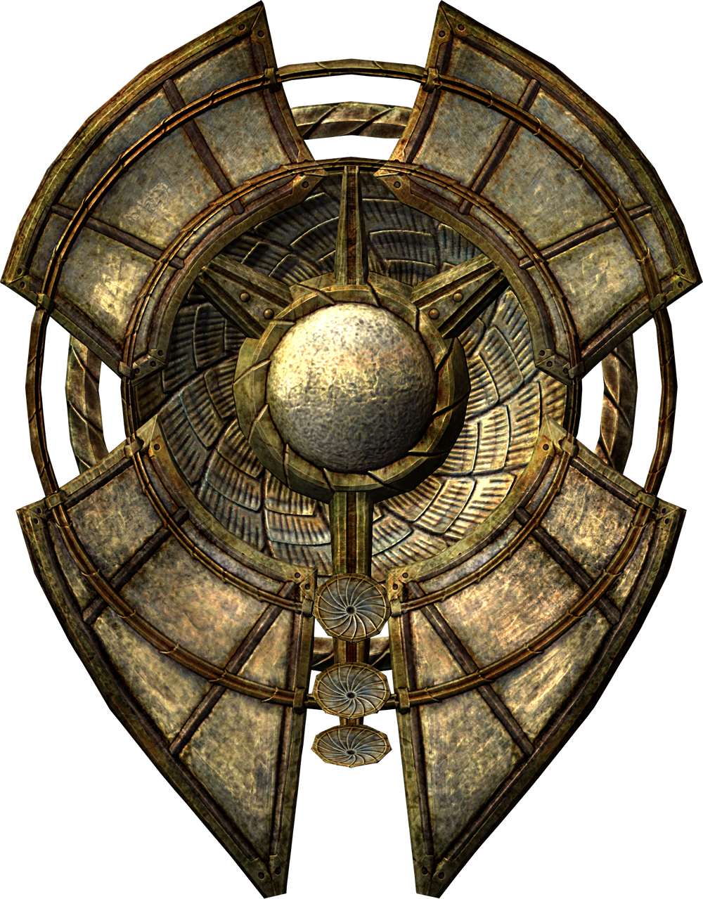 This shield has an odd design but is clearly made from a Dwarven style. One of a few artifacts made from Dwarven metal and themes, it has still been imbued with Daedric magic. This shield has often been part of many tales across the ages of fights against cults of worship, whether divine or fiendish. The most well-known story about Spellbreaker relates to a story between its wielder, King Rourken of the Dwemer, and the Legendary Wizard, Shalidor.