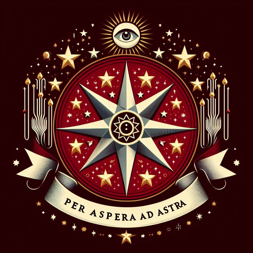 Sotto la stella, un nastro avvolge delicatamente la base dell'anello galattico, su cui è inciso il motto della Casata Starweaver: "Per Aspera ad Astra". Queste parole latine, che significano "Attraverso le difficoltà verso le stelle", riflettono l'impegno della casata nel superare le sfide attraverso la perseveranza e la ricerca della verità e della bellezza nel mondo e oltre.