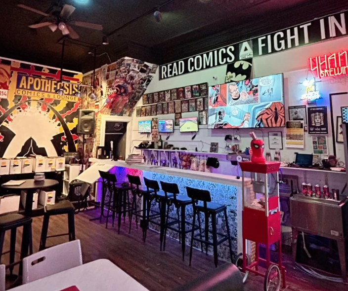 - Framed comic art and posters ranging from Golden Age classics to modern indie works