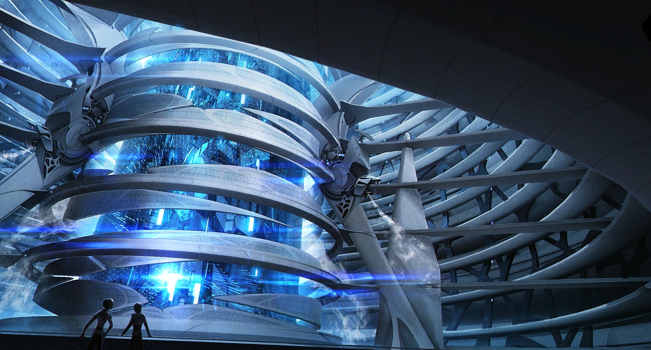 En el corazón del edificio se encuentra una inmensa cúpula de cristal, diseñada para parecer un ojo vigilante. Desde su interior, uno puede contemplar el cielo y las estrellas, creando la sensación de que los propios dioses observan y protegen el conocimiento almacenado. Los pasillos y cámaras están llenos de estanterías que albergan libros, pergaminos, discos de datos y servidores de datos, recopilados de diversas civilizaciones a lo largo de la galaxia.