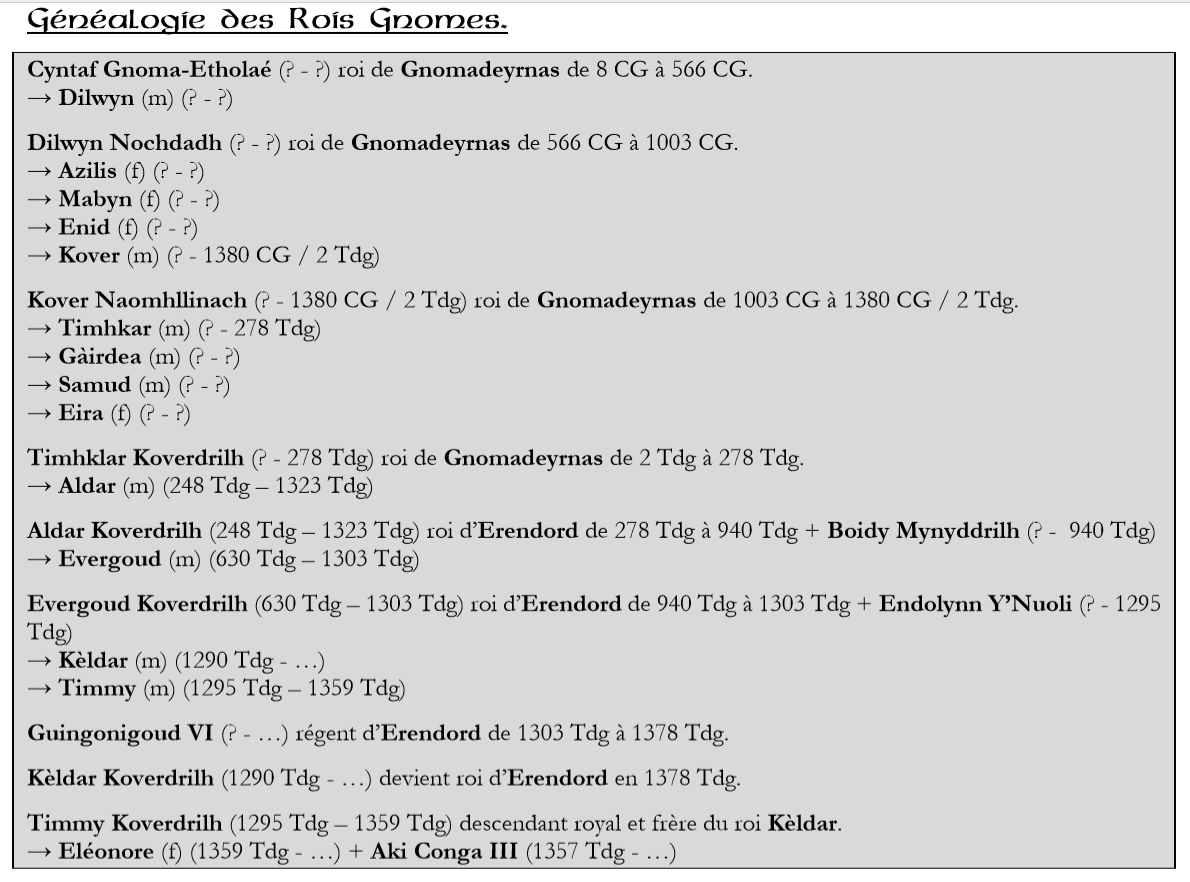 La dynastie fonde Erendord après la chute de Gnomadeyrnas et est toujours sur le trône avec Kèldar