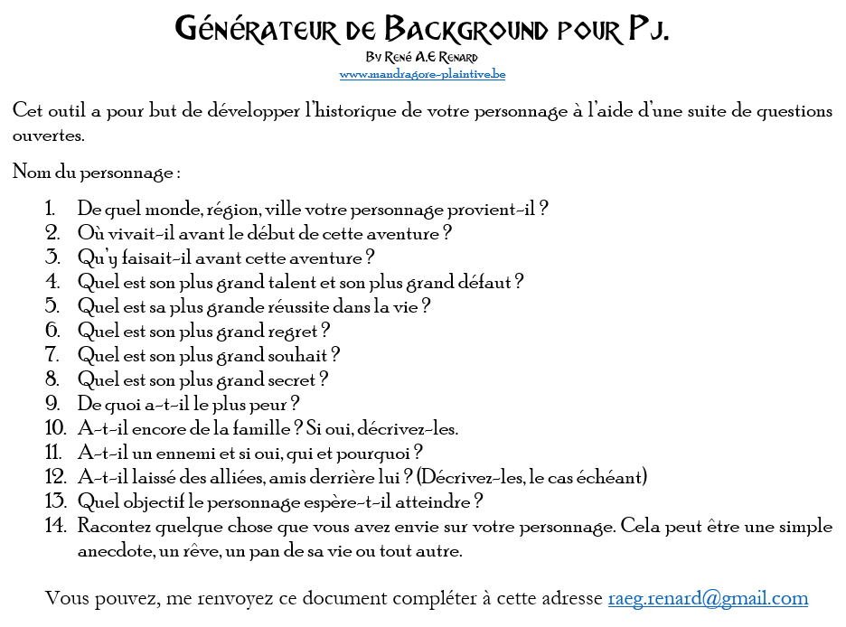 Salut à tous, comme on ne joue pas très souvent, voici (pour ceux qui veulent) un petit questionnaire pour approfondir l'historique de votre personnage. ;)