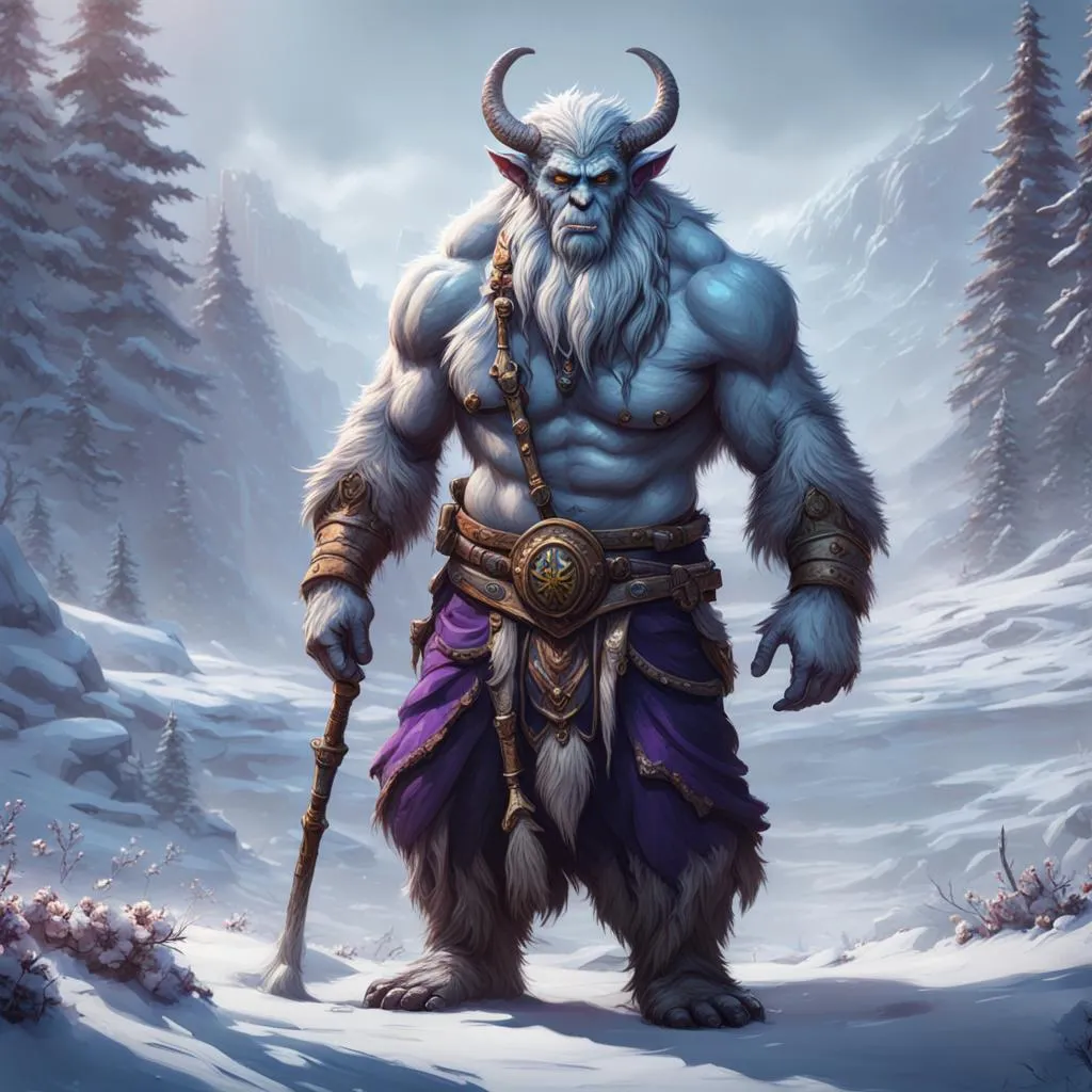 The Yeti are powerfully built humanoids with bluish skin, horns, red eyes and faces that vaguely resemble those of apes but are far more emotive. Their bodies are entirely covered with long, dense fur except for the palms of their hands, the soles of their feet, and their faces; this fur can range in colour from white, through various browns, to grey and black. The males also tend to have tusks that extend from their lower jaw and over their top lip, and far more muscle mass than the females.
