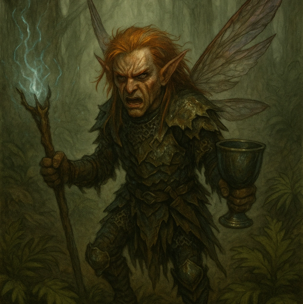 In the depths, he pleaded to the seas for a second chance, a way to earn his life again. He offered gold, blood and even his own soul just so he wouldn't drown like a rat knocked from its ship. To his delight and horror, Sionnaine took notice and a pact was struck. She did not claim his soul, instead taking his mind, remoulding it to her fancy, and leaving the Sprite with a single cup of tarnished gold large enough for him to lay in.