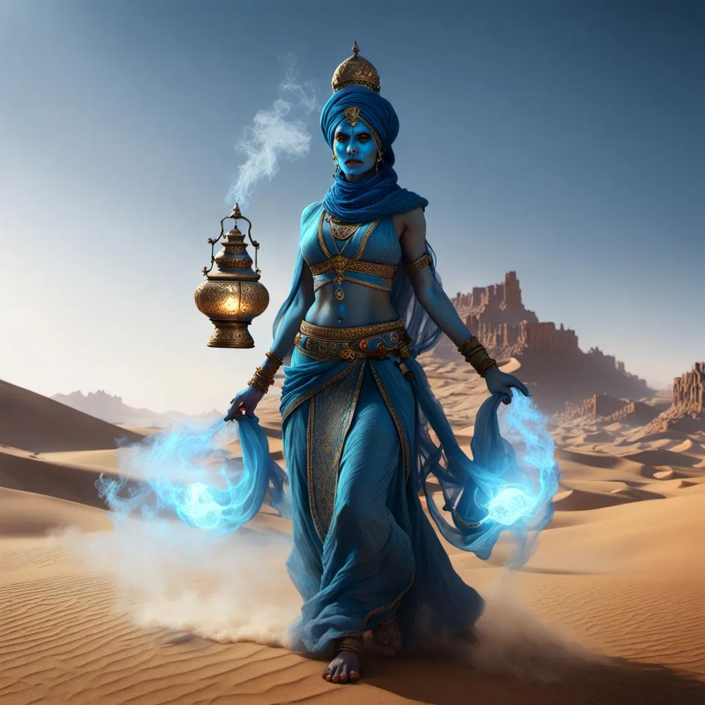 The Djinn are fire spirits, humanoids with skin made of blue flames, hair of black smoke, and eyes of burning red coals. However, they are shapeshifters so this doesn't necessarily mean they will appear like this, as often they will simply reduce their forms into a cloud of black smoke.
