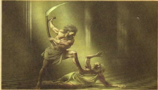 The Titans fight Uranus and eventually he is defeated by Cronus. Cronus cuts off Uranus' genitals with a sickle and throws them towards Cythera. Aphrodite emerges naked from the sea and travels to Cyprus. Word count: 34