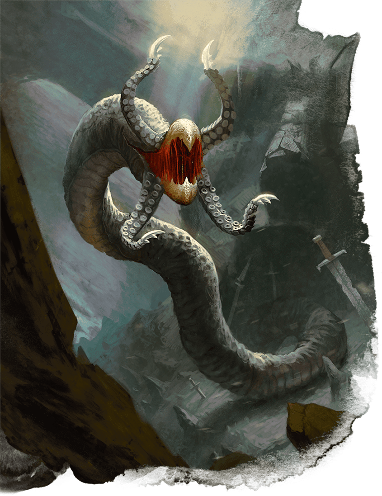 Als wir uns aus dem Schlafsaal zurückzogen und dem langen Gang von Süden nach Norden folgten, erblickten wir den versteckten Eingang zwischen den Trümmerteilen des eingestürzten Gemäuers, den Gerald uns bei seinem Erkundungsflug angezeigt hatte. Wir näherten uns diesem Raum jedoch noch nicht, sondern entschieden uns, links davon einen Blick hinter eine Tür zu wagen. Imane Ryuji schreitet voraus. Da die Tür in die Jahre gekommen ist, geht sie nur mit einem lauten Knarzen auf. Sie und die Gruppe erblicken einen kapellenähnlichen Raum, den sie dann auch betritt. Plötzlich stürzt aus dem Nichts ein schlangenartiges Monster mit mehreren Tentakeln und einem schnabelartigen Maul aus den Schatten auf sie herab – ein sogenannter Grick