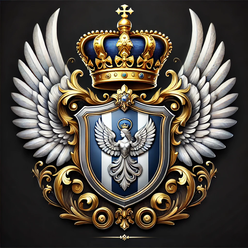 - Brasão: Uma coroa dourada sobre um escudo de prata e azul, adornado com asas angelicais.