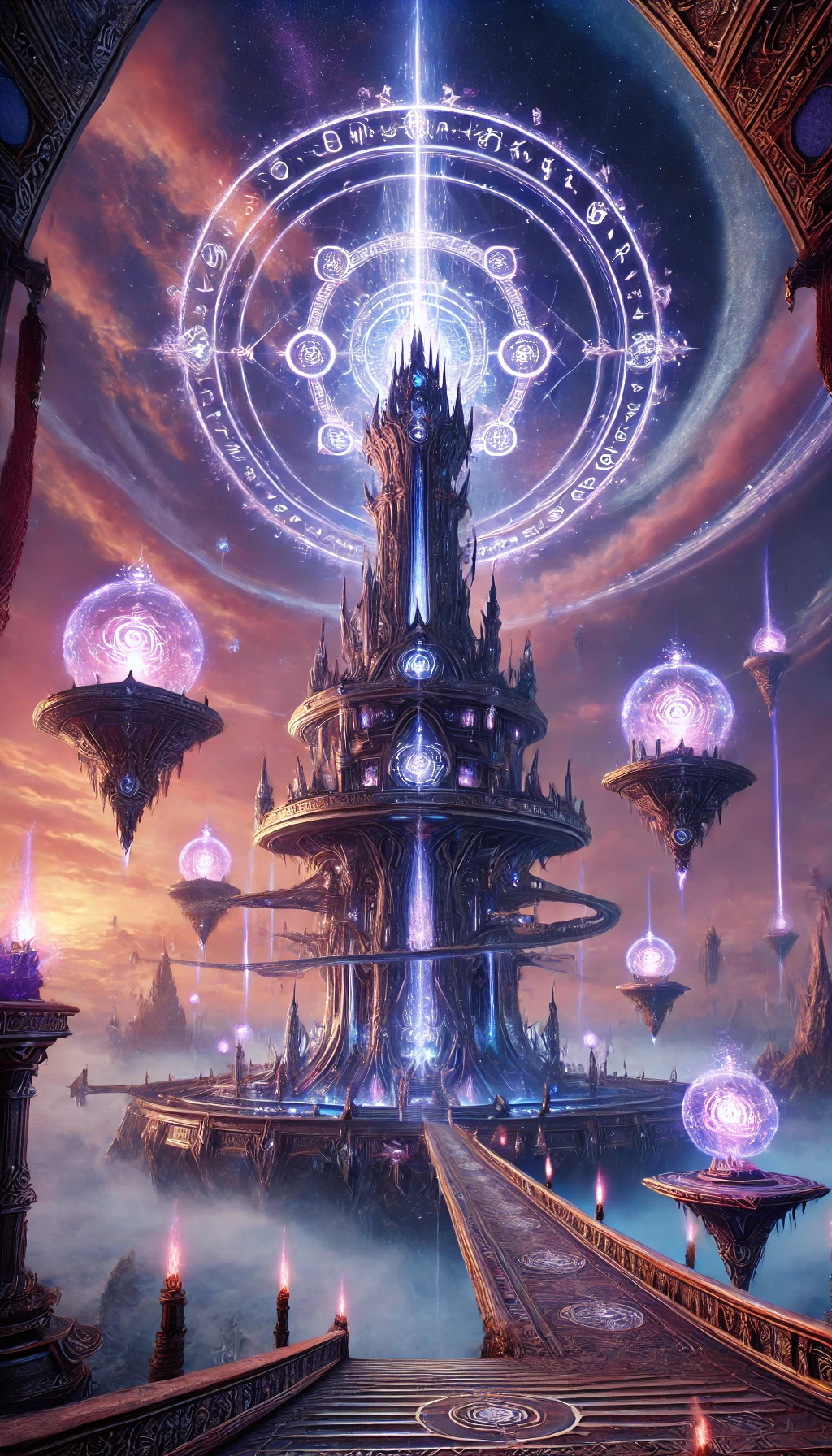 Surrounding the tower, levitating crystals glided through the air in intricate patterns, their glowing hues changing as they pulsed with arcane energy. These floating conduits of power were more than ornamental; they sustained the tower’s defenses and fueled its magical core. Spiraling bridges and staircases connected the various levels of the tower, but they were not static. These pathways, partially physical and partially magical, appeared only when the tower deemed it necessary, a testament to its living, sentient nature.