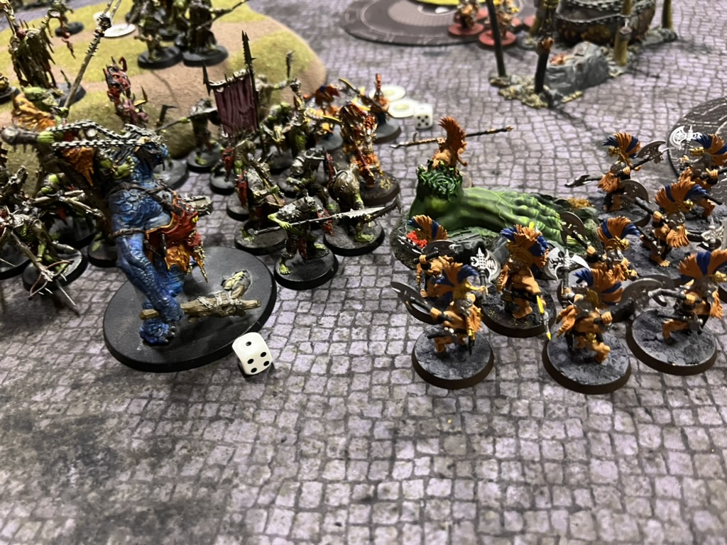Torrent of emotions was sweeping Snug and he was hopeless to stop it. He couldn't even name most of the emotions he felt. As such, he just stood over the half scorched body of Bug, shaking. All around him there was chaos, orruks running around and yelling, without the usual laughter that followed a hard won battle. What a battle. They came into this townlet expecting weak humies ripe for the taking. Yet only silence greeted them, empty streets full of charred rocks and craters. Even the swampcalla seemed unnerved. Then out of ground they appeared, gingerhaired balls of muscles with fire in their eyes. Snug and Bug were laughing then, as they unleashed first volley, fully expecting the mob of duardin carrying weird staffs to be decimated. Yet that did not happen, golden runes shined bright, warded off the damage and their staffs unleashed torrents of fire back, decimating Bug's whole squad. Snug remembered that moment of astonished fury he felt. His vision grew reder then normal as he unleashed volley after volley with no apparent effect. It was only when the midgets charged Knarl's battleline that the fate began to change. As the very Foot of Gork stomped on the charging gingers, Břřok's troggoth hewed them down with his clubs.