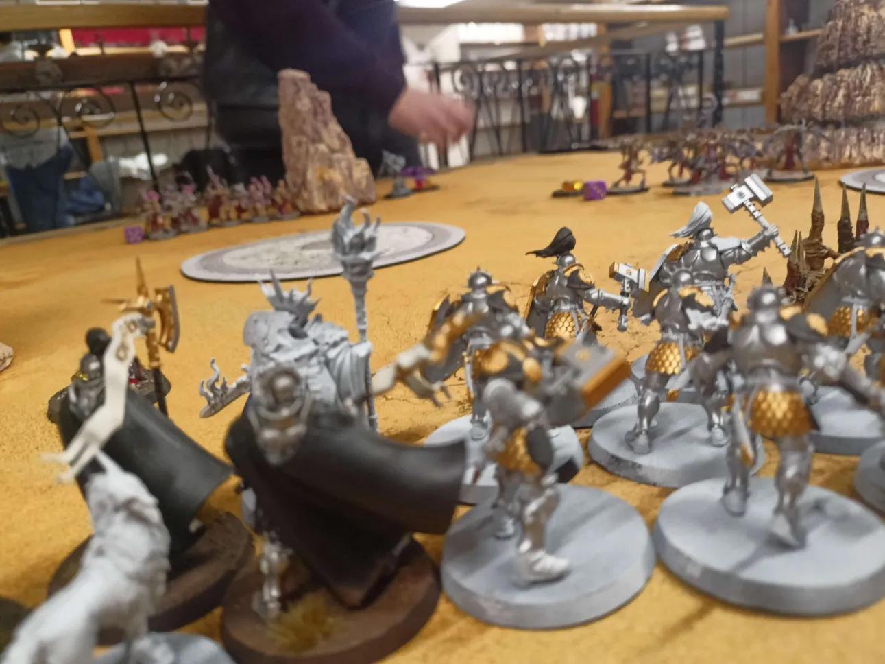 As the twin suns of Aqshy beat mercilessly down upon the jagged ridges of the desert, the Followers of Agonizel emerged in a swirling haze of perfume and pain, their laughter echoing across the red rocks. Led by the twisted Herald of Agonizel, Aluthari Barbsong, their decadent procession swept forward to seize the central canyon, claiming the high ground with impudent speed. At the command of their commander Elaine Soulsurge, the Black Aegis surged forward with righteous fury. A shield wall of Hearthguard, their armor glinting silver beneath the harsh light, charged into the heart of the enemy. The clash was brutal — shrieking fiends and elegant blade-dancers collided with stoic defenders in a storm of blood and thunder.