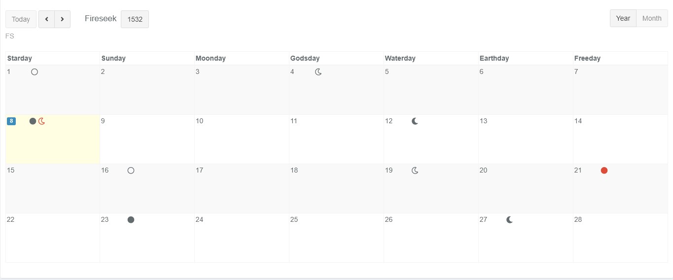 | Starday | Sunday | Moonday | Godsday | Waterday | Earthday | Freeday |