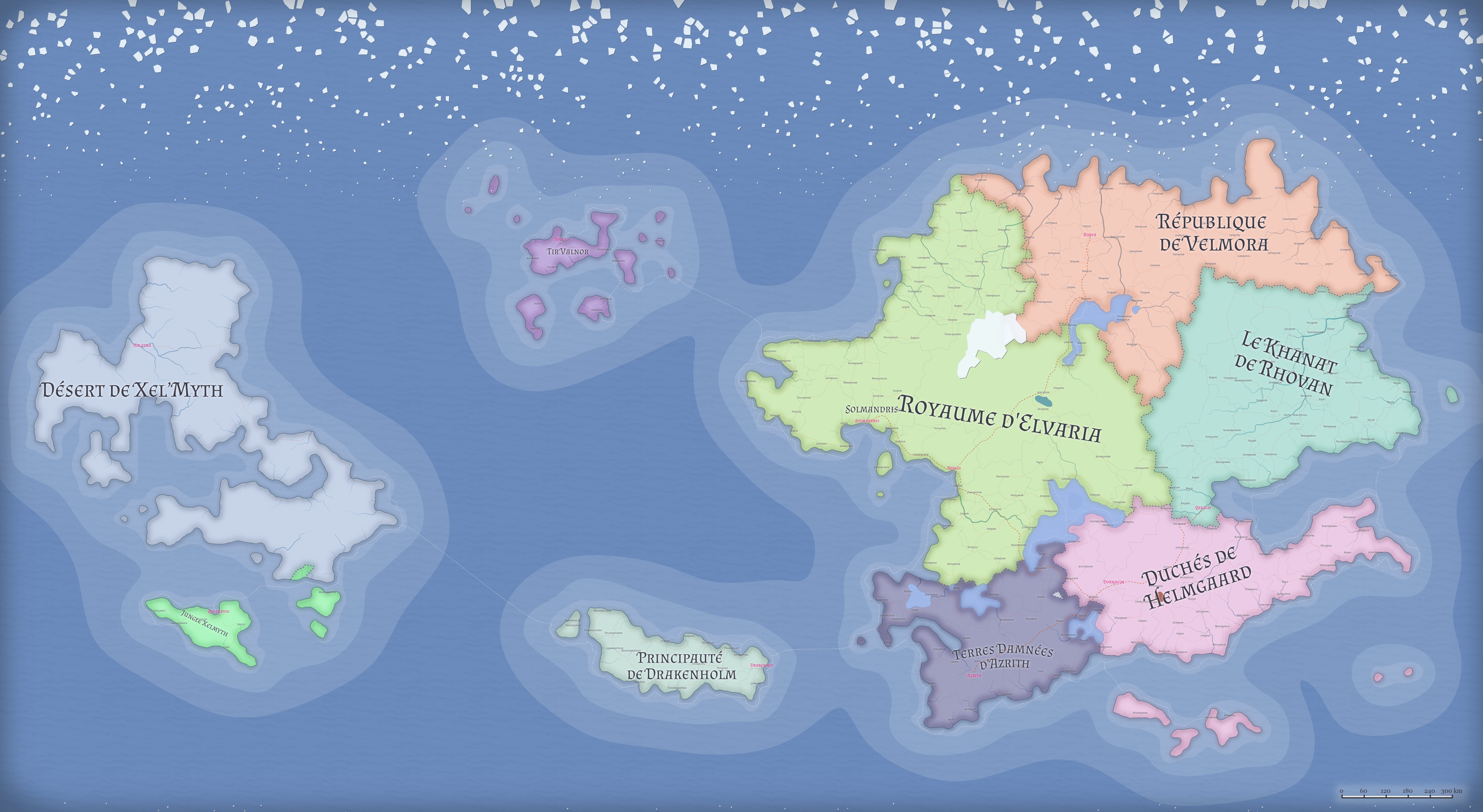 Valoria est un monde vaste et contrasté, où des empires se sont élevés et écroulés, où des civilisations oubliées dorment sous la surface et où chaque terre recèle ses propres dangers et opportunités. Voici les principaux continents et archipels qui composent ce monde: