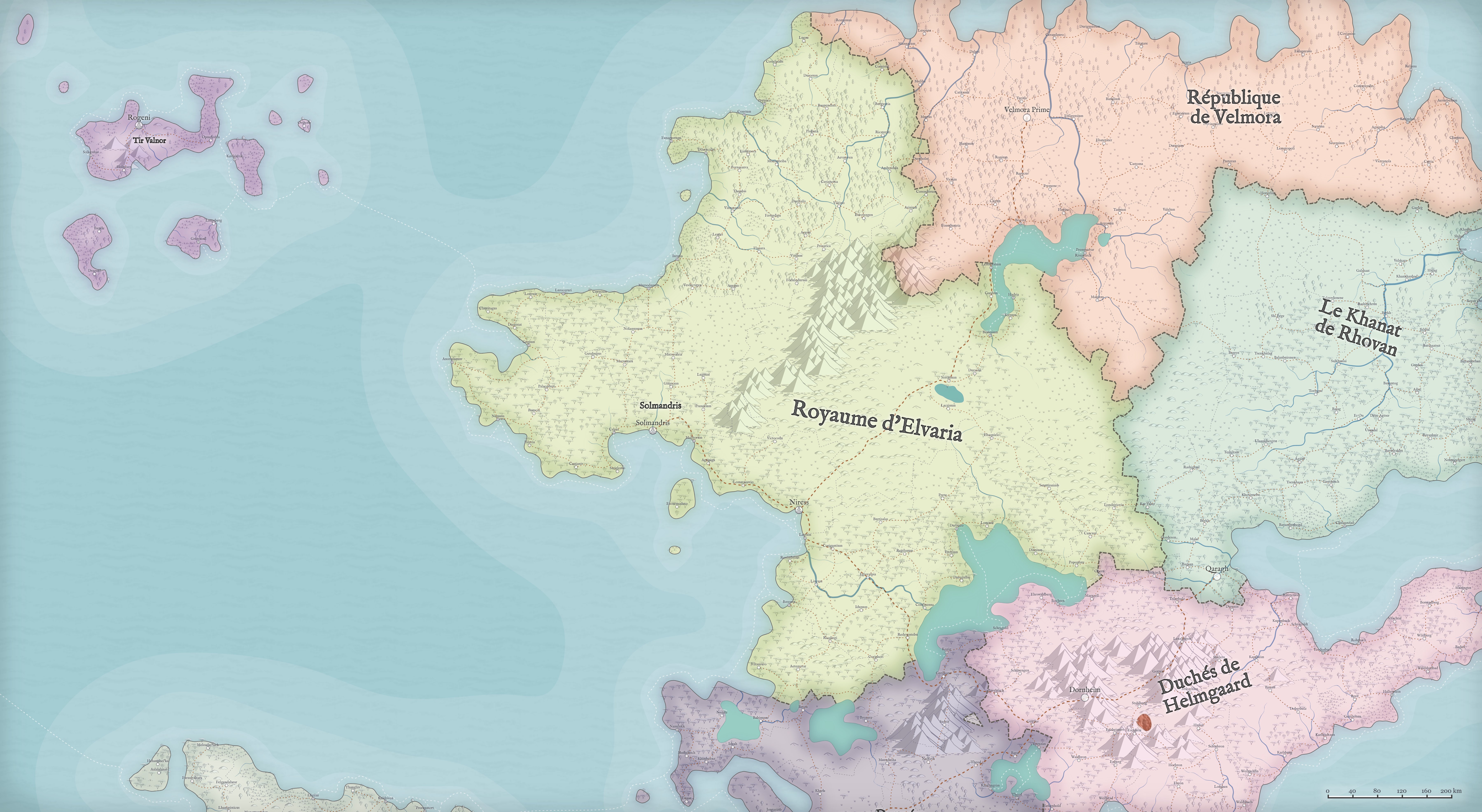 Ă lâouest de Valderis sâĂ©tend le Royaume dâElvaria, fier hĂ©ritier de lâancien Empire Solmendar, dont il a conservĂ© une partie des traditions et de lâinfluence. Jadis maĂźtre incontestĂ© du continent, lâEmpire sâest fragmentĂ© aprĂšs des siĂšcles de guerres et de crises, donnant naissance Ă de nombreux royaumes indĂ©pendants. Elvaria, bien que rĂ©duite dans ses frontiĂšres, demeure lâun des Ătats les plus puissants de Valderis.