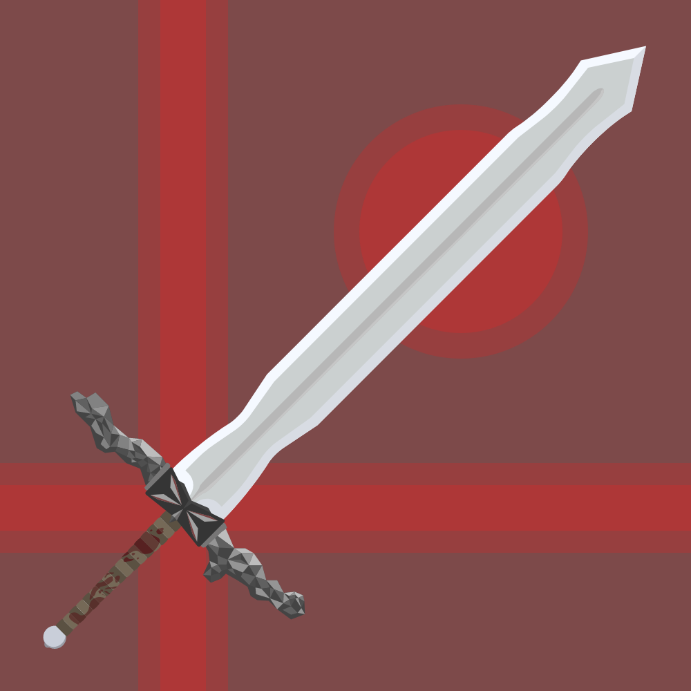 A large greatsword with a brilliantly gleaming wide blade, and a substantially large fuller running down the center. The enormous guard of the sword seems to be made from some sort of chiseled onyx. The hilt is wrapped in somewhat bloodied leather straps, terminating in a somewhat mundane pommel.