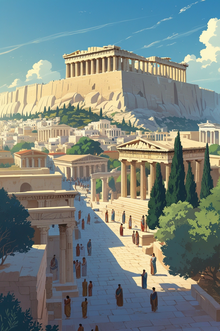 Athens stands proud upon its hills, its white-stone temples catching the sun like blades of light. It is a city of reason and rhetoric, of law and ambition—a polis beloved of Athena, who gifted it the olive tree and the spirit of wisdom. Her Parthenon crowns the Acropolis like a crown upon the brow of a queen.