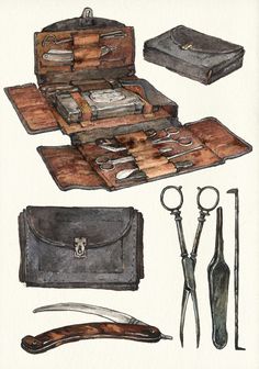 Las herramientas de peletero incluyen un cuchillo, un mazo pequeño, una bordeadora, una perforadora, hilo y trozos de cuero.