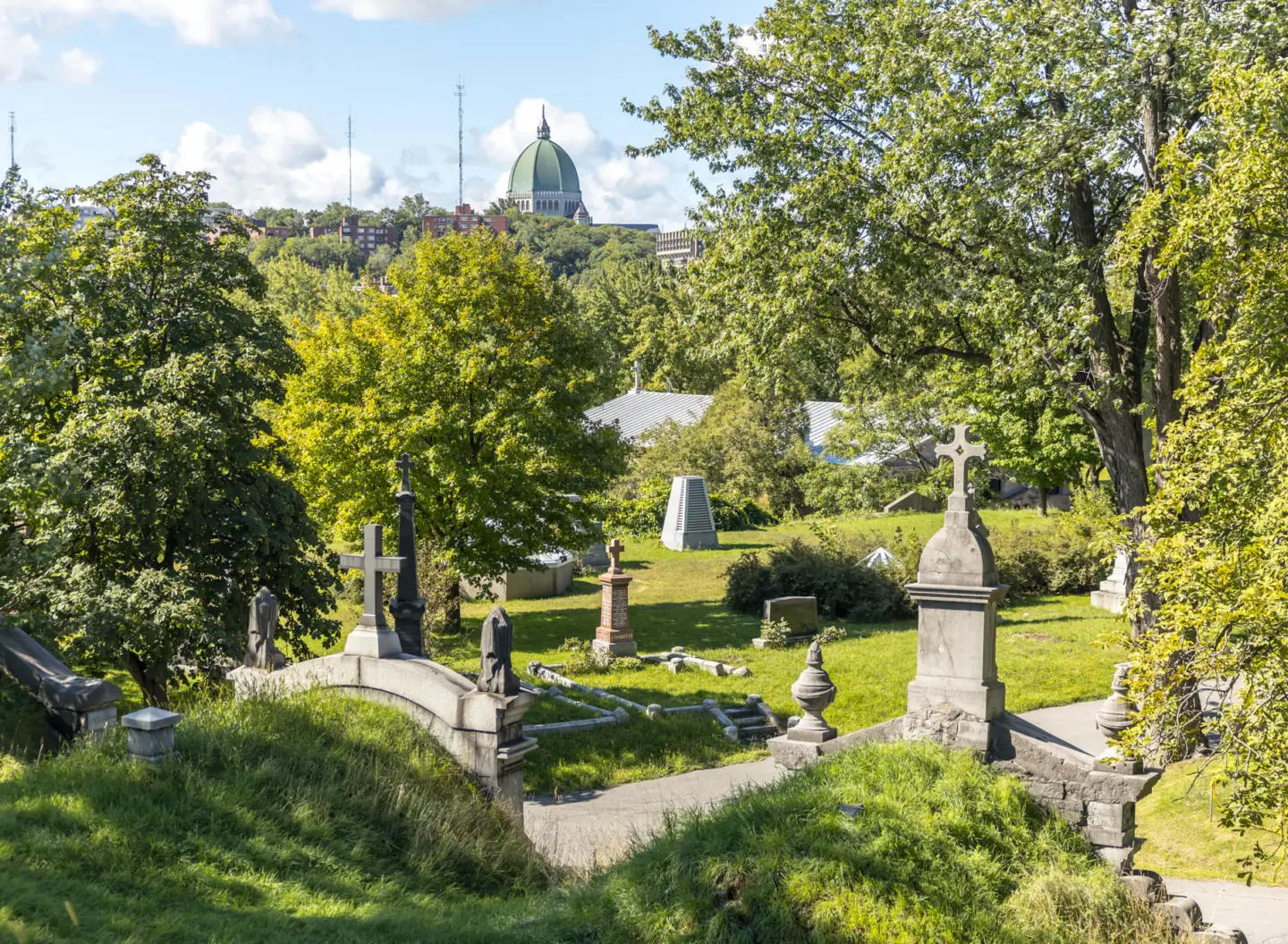 Ce vaste sanctuaire de calme s’étend sur 343 acres. Allées sinueuses bordées de cyprès, mausolées néoclassiques et stèles patinées par le temps s’y mêlent. La lumière tamisée traverse les érables centenaires, illuminant des sculptures d’anges silencieux. Un lieu où l’histoire et la nature coexistent, niché sur les pentes boisées du mont Royal.