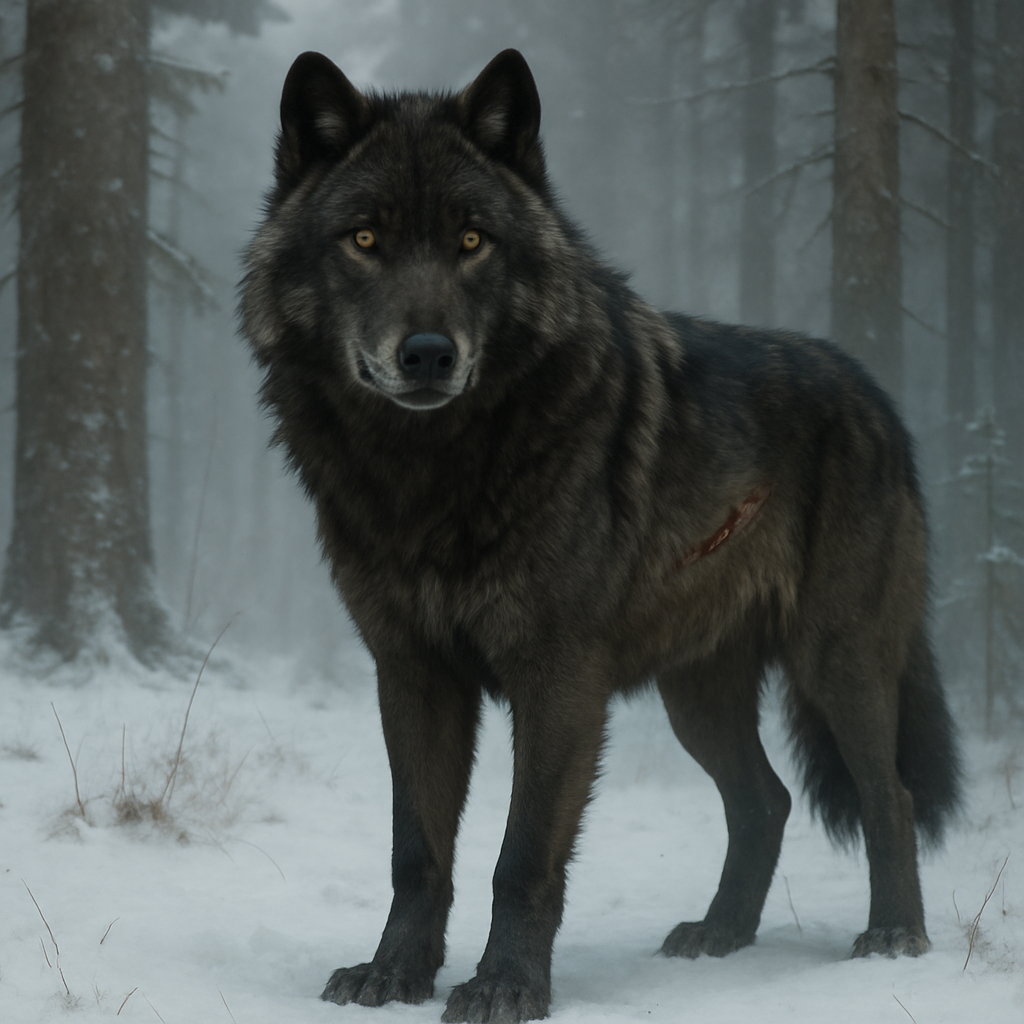 - Apparence : grand loup gris foncé, épaules massives, regard perçant jaune doré, cicatrice ancienne au flanc.