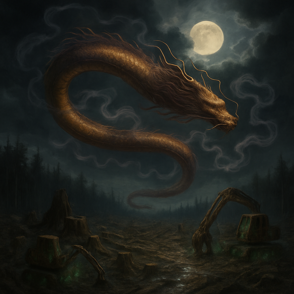 Dans l’air se tord une forme longue, vive comme une lame dissimulée. Son éclat oscille entre l’or et le sang, et des volutes d’encens fument à chacun de ses passages. Ses yeux, brûlants de dette et de promesse, veillent sur les serments brisés, traçant leur loi dans le silence.