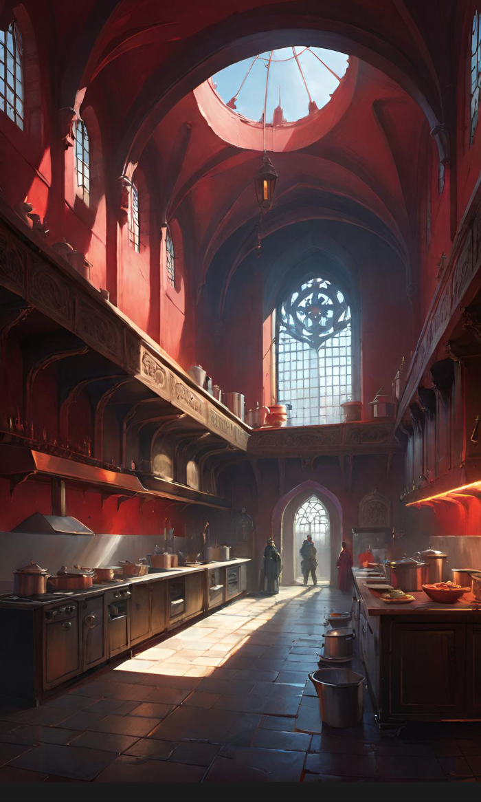 Mechanical spits developed by the Tongs in the House of Time turn great slabs of meat over a roaring fire at the far end of the kitchens. The same institution invented the steam closets along the left wall that are capable of keeping many dishes warm whilst not drying them out.