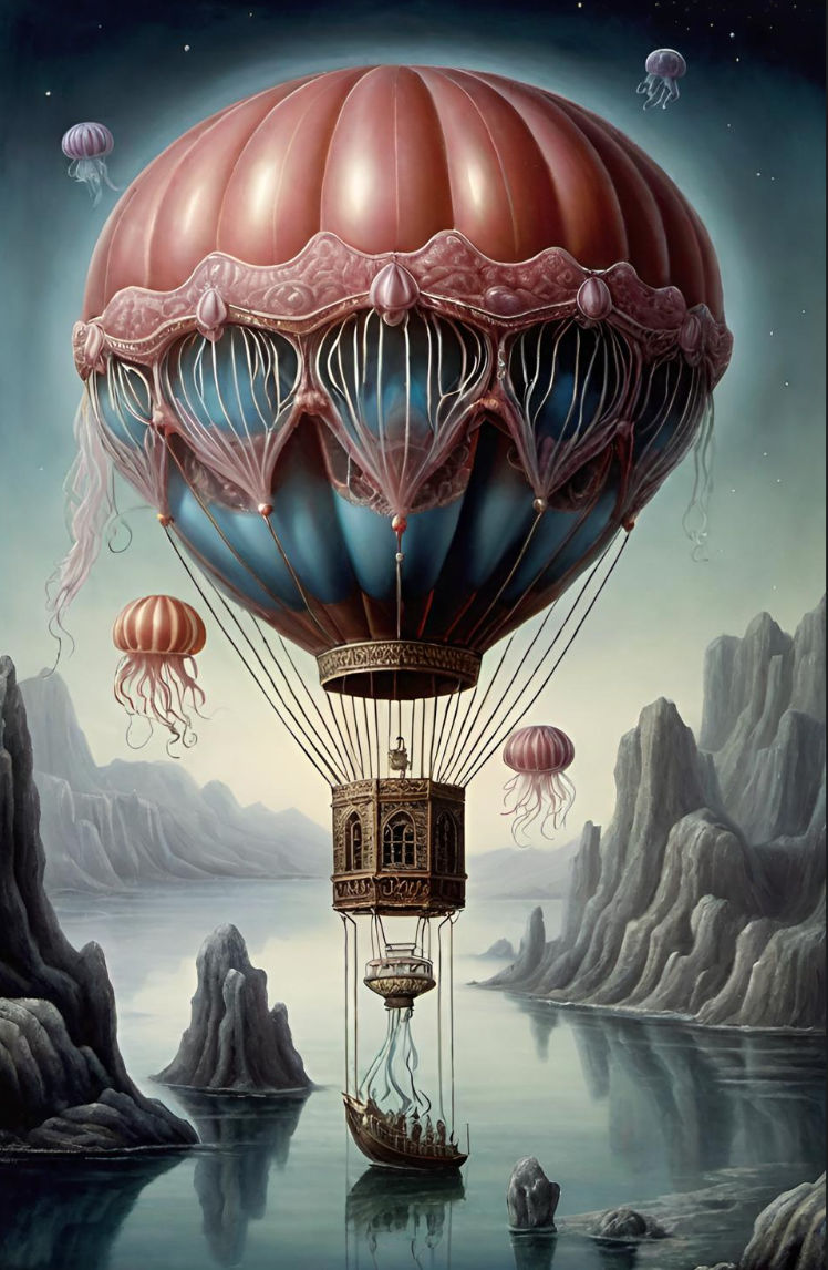 Balloons made from the dead bodies of the Zorga, a type of giant floating jellyfish that wander the southern skies of Miradorium. Sky Barges are reserved for Imperial use so if anyone else wishes to lift into the air or visit Songborne they must travel by this type of hot air balloon.