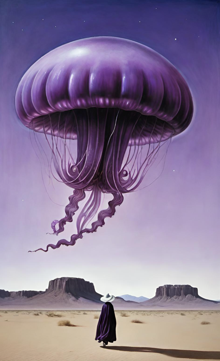 Giant jellyfish type creatures that use their light weight inflatable bodies to float around the southern skies of the kingdom feeding off swarms of flies that stick to and are consumed through their lightweight skin. Word count: 35