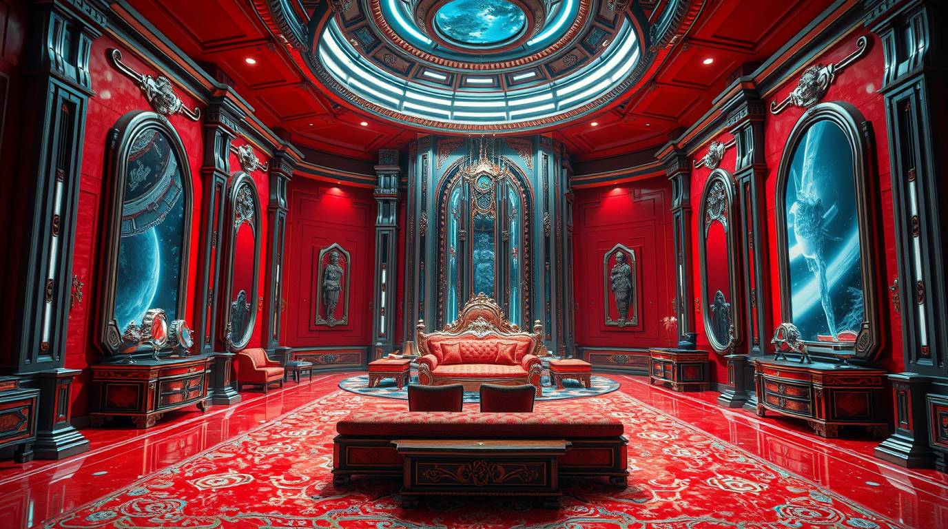The room is opulent. There are paintings of stars and planets on the walls as well as a large mirror. There is a large painting against one wall.