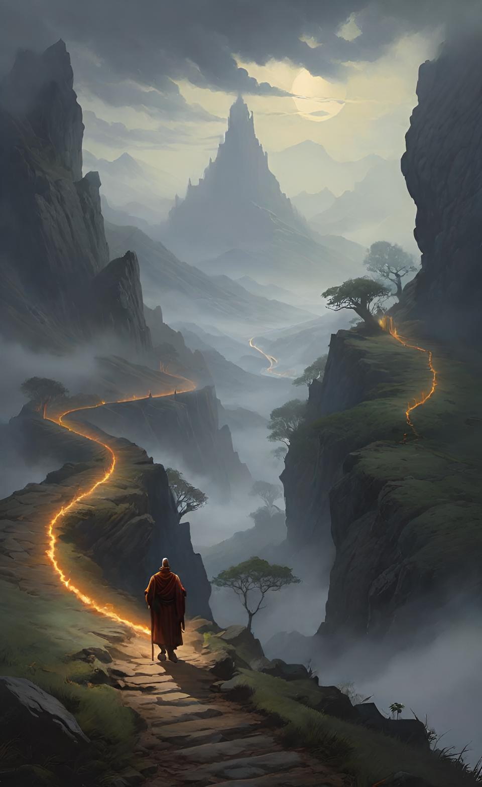 A prayer path, walked down by chanting pilgrims forms a circular route through misty highlands. Monks and nuns here are known for their mastery of Wind Calls, using them to clear paths for pilgrims through dangerous fog banks. The hills themselves are said to remember ancient prayers.