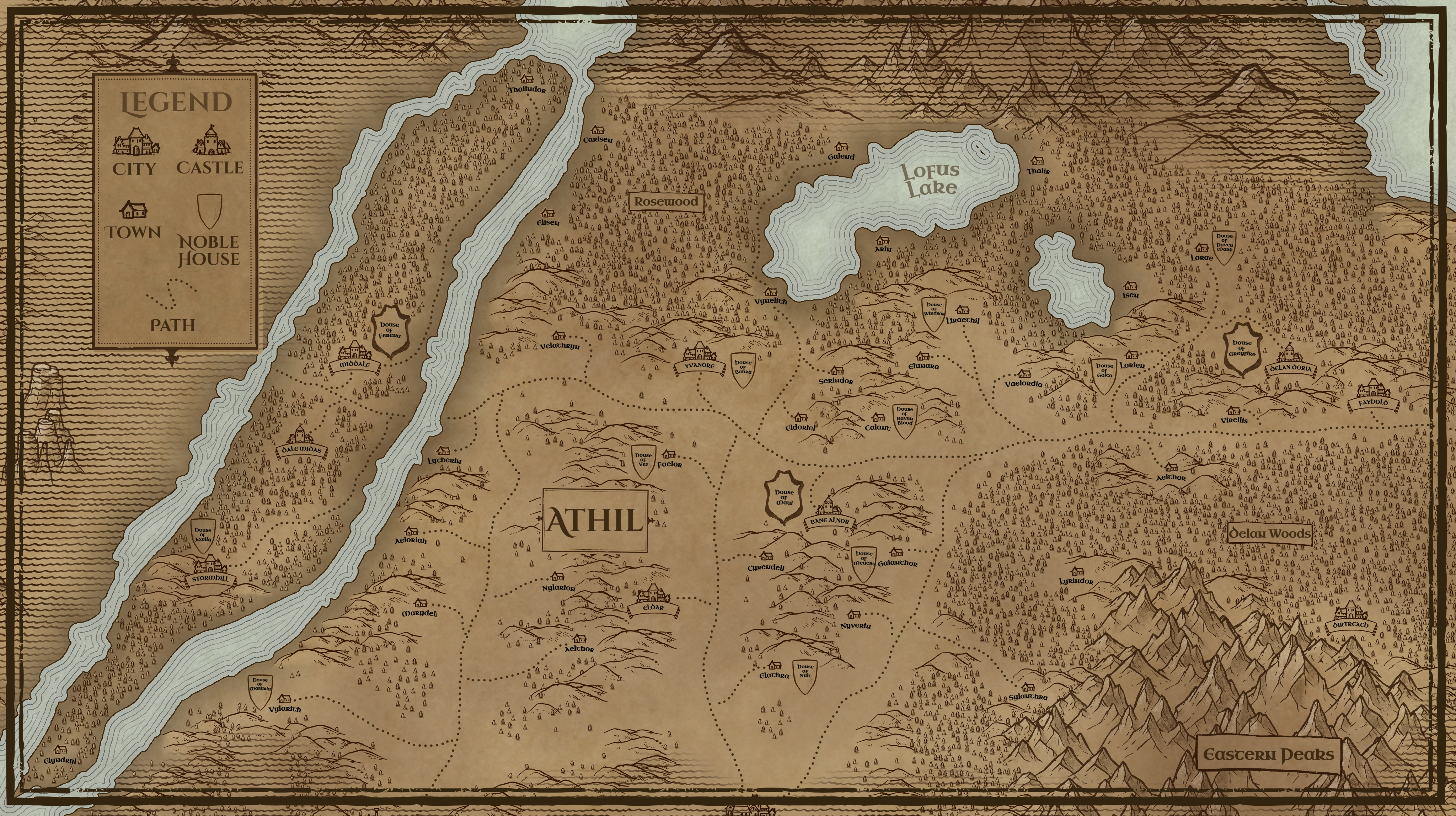 Athil has no centralized government since the death of its last king in 1632 ADM. The region is now divided among different noble houses, with three large and powerful houses—House Ferena in the west, House Maul in the center, and House Greyfire in the east—governing most of Athil. These houses have many lesser noble houses as their vassals. Athilian society is diverse and dynamic, with each noble house maintaining its own customs and traditions while contributing to the broader cultural mosaic of the region. The noble houses wield significant influence and power, engaging in alliances, rivalries, and political maneuvering to maintain their status. The region is known for its robust warriors, skilled artisans, and rich cultural heritage.