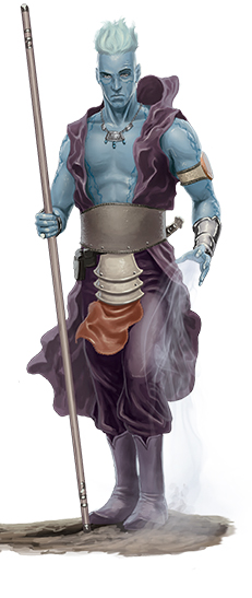 Air Genasi usually have light blue skin, hair and eyes. A faint but steady breeze accompanies them, stirring through the hair and clothing. Some Air Genasi speak in hoarse voices, characterized by a weak echo. A few show strange patterns in their flesh or grow crystals from their scalps.