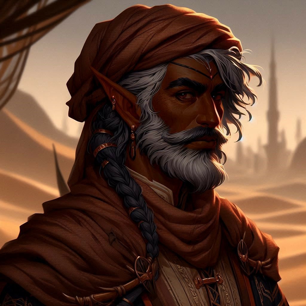 Rasa "Ziki" Arziki was born in the harsh, sun-scorched desert city of Khar Benidir, where survival depended on cunning and resilience. Growing up in poverty, Ziki learned the art of negotiation, barter, and trade from an early age. Despite the scarcity of resources, he thrived on the challenge of turning meager beginnings into profitable ventures. His flowing robes are adorned with a myriad of rings, chains, and other intricate adornments that jingle and chime melodiously as he moves. Each piece tells a story, collected from various places and trades, and together they create a symphony that Ziki manipulates to weave his magic. In his youth, Ziki was deeply devoted to Adellum, the God of Luck. He believed that fortune favored the bold and that his success was a blessing from Adellum. Ziki's devotions included rituals and offerings to ensure continued prosperity. His faith in Adellum was unwavering, and his luck seemed endless. As his reputation grew, so did his wealth. Ziki's skill as a merchant brought him not only wealth but also love. He met Elara, a skilled weaver from a neighboring town. Their love blossomed quickly, and they married, vowing to build a prosperous future together. However, Ziki's obsession with wealth and fortune led him to make risky deals and dangerous bargains. One such deal involved a cursed artifact, promising immense wealth at the cost of something precious. Blinded by desire, Ziki ignored the warnings. The curse struck, leading to the untimely death of his beloved wife, Elara. Devastated and guilt-ridden, Ziki realized that his pursuit of fortune had brought him nothing but misery. He abandoned his faith in Adellum, feeling betrayed by the god he once revered.