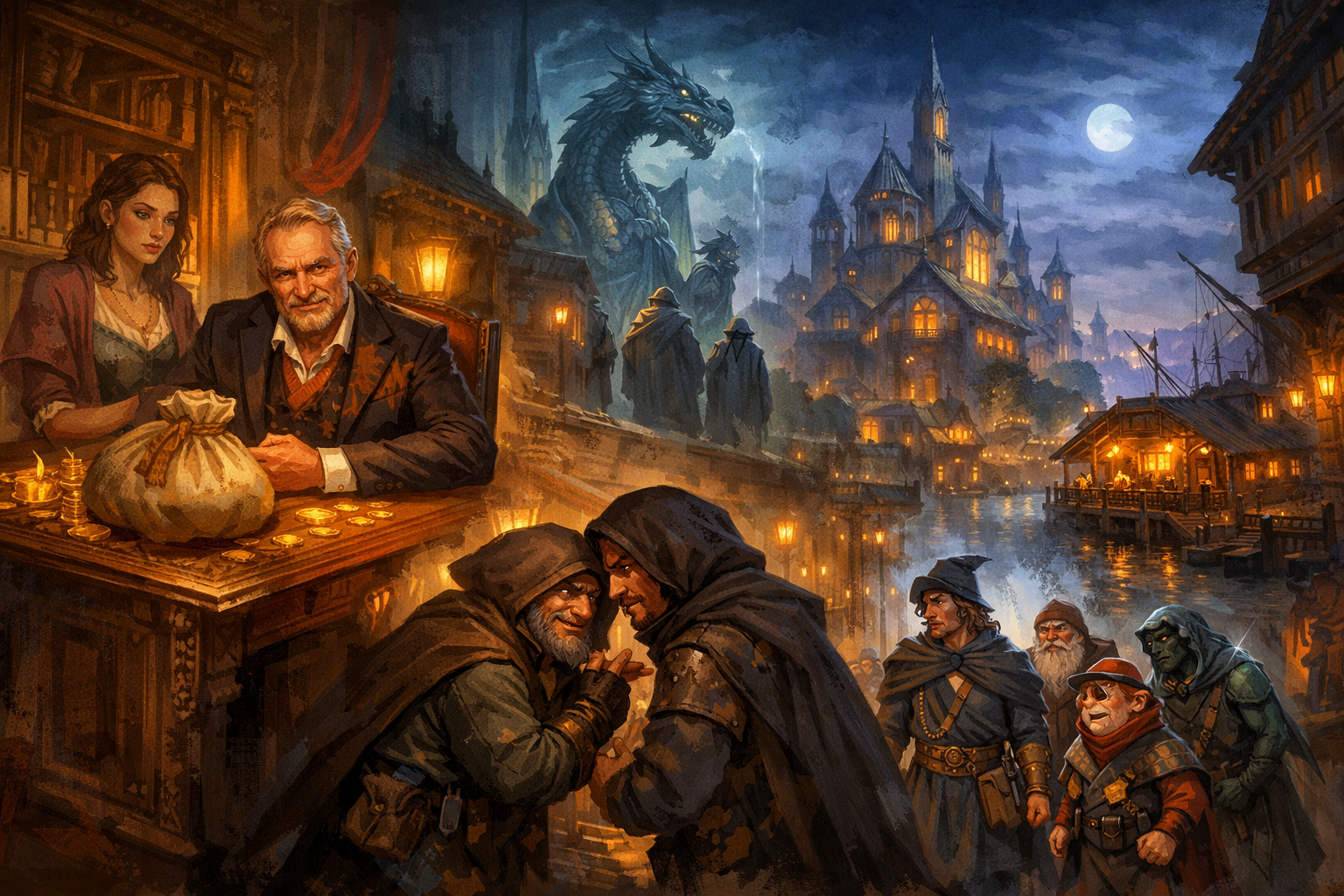 Davkas Grosko and Juulia Troski visited the Merchant’s Guild, where they waited in line to obtain trade documents required to legally sell their fruit. Davkas cleverly skipped the line to get them faster. Meanwhile, Emberglow ran into Arnie Knucklebog, who told him some of his old mercenary allies were also in Farrock. Seeing a chance to form his own crew, Emberglow asked Arnie to gather them. They found Thorne, the kobold wizard, and headed towards the Mage Guild to find the others. However, access to the library required full guild membership, which would take time. Instead, they were advised to seek Captain Jack, a man who has past experience with resurrection magic. Butters P. Nutts went to the Merchant’s Guild as well, hoping to collect profits from his deal with Selenar Macadamia. He met with both Valys Macadamia and her father Selenar, who revealed he had once betrayed Butters’ father in business, leading to his downfall and death. Selenar had also now taken credit for Butters’ peanut butter invention. Despite the betrayal, Butters took the sack of 3,000 gold and left, vowing revenge.