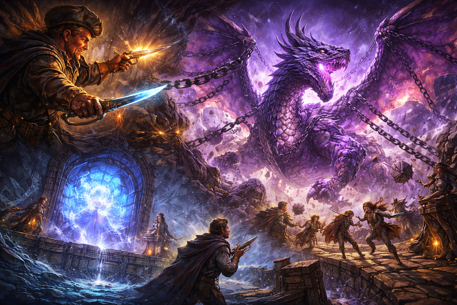 Soon after, Red Flint arrived from a different entrance, accompanied by five Dragonborn temple goers. Flint secretly found a Planar Compass (a magical item) and kept it hidden from the party. The group then descended further through a large hole and entered a void-crossed chamber filled with bridges. At the center was a massive arcane portal, and surrounding it were Red Knights and a commanding officer, identified as Bryan Ryker, commander of the Western Kingdom's forces. It was revealed that the “beasty” Jack had spoken of was a massive Amethyst dragon, imprisoned and being tortured to fuel the portal, allowing the Western Kingdom to move their fleet across the sea. In a bold move, Juulia Troski cast Geas on Bryan Ryker and commanded him to free the dragon. The dragon, once released, unleashed chaos, disintegrating the Red Knights and nearly turning on the party.